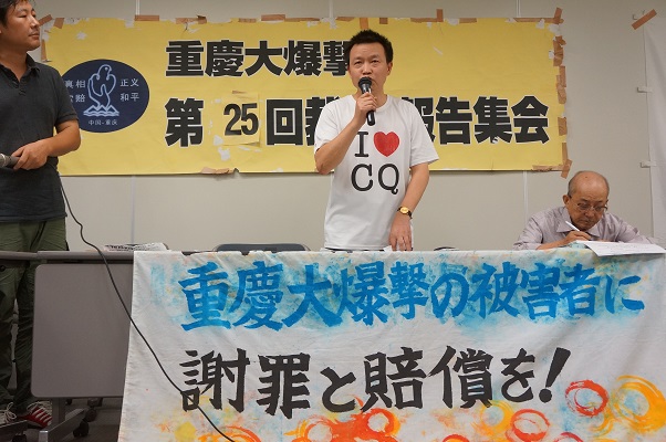 壇上向かって右から重慶の支援者王永鋼さん、通訳の朱弘さん