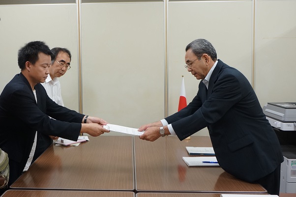 内閣府へ陳情書を提出する重慶の支援者王永鋼さん(左)
