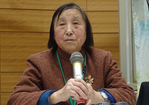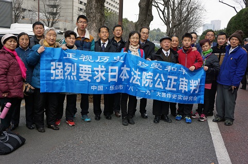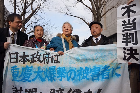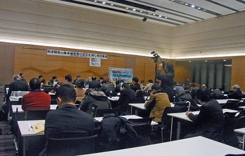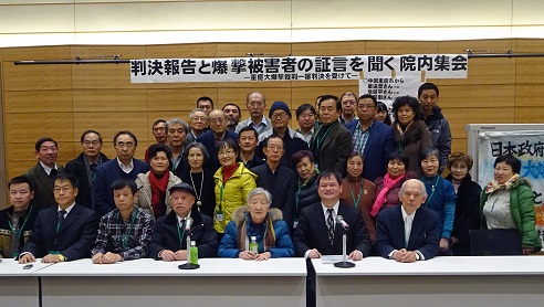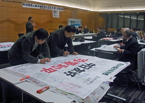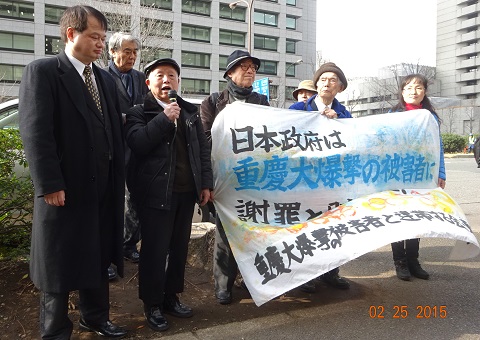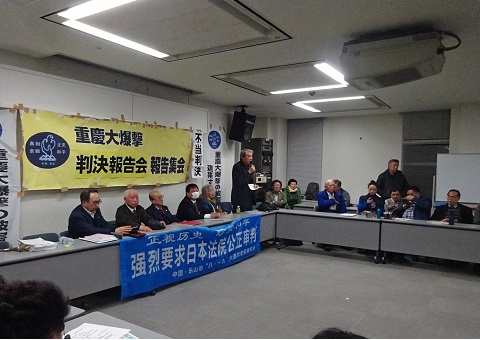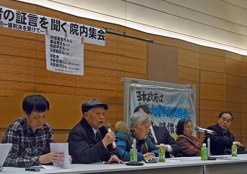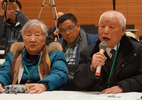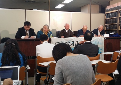 壇上左から通訳の張剣波さん、重慶の原告危昭平さん、重慶の原告粟遠奎さん
